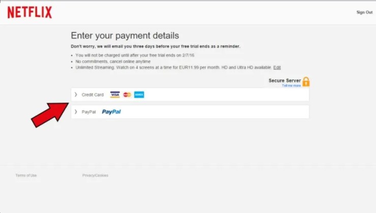 Here’s what usually scares subscribers to the free trial: Netflix asks for your payment method details. This can be a traditional credit card or PayPal account. Relax, we’re not burdened with anything here yet, and we need to provide the data for verification to prove that we’re not some “trial month-dizzying” scammer. As we wrote, a few days before the first billing, the service provider sends an e-mail, at which point we can even switch plans or cancel the subscription.